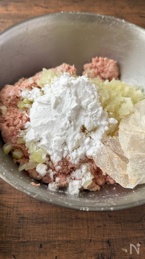 (4) さらに粗熱を取った玉ねぎと片栗粉を加え、よく混ぜ合わせる。