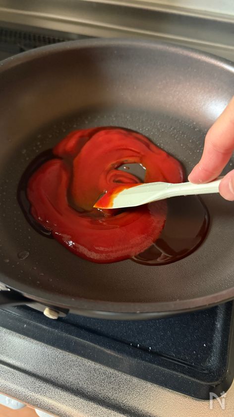 (7) さっとフライパンをふき、【B】を混ぜてソースを作る。
