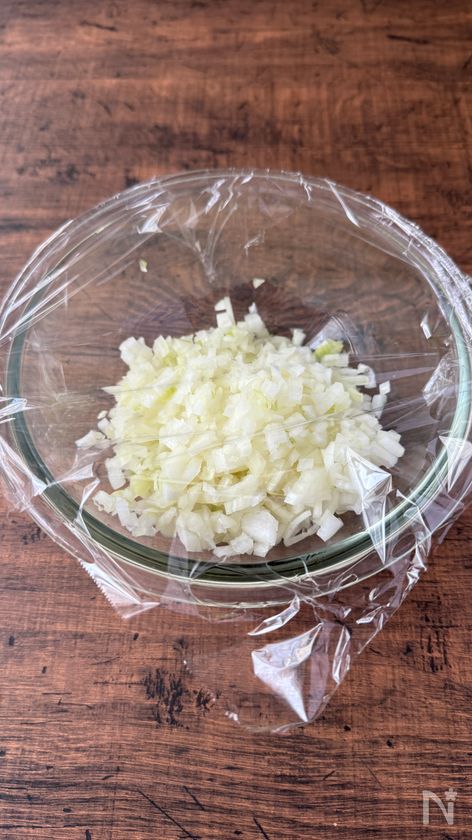 (1) 玉ねぎはみじん切りにし、耐熱容器に入れ600wレンジで1分半加熱後粗熱を取る。