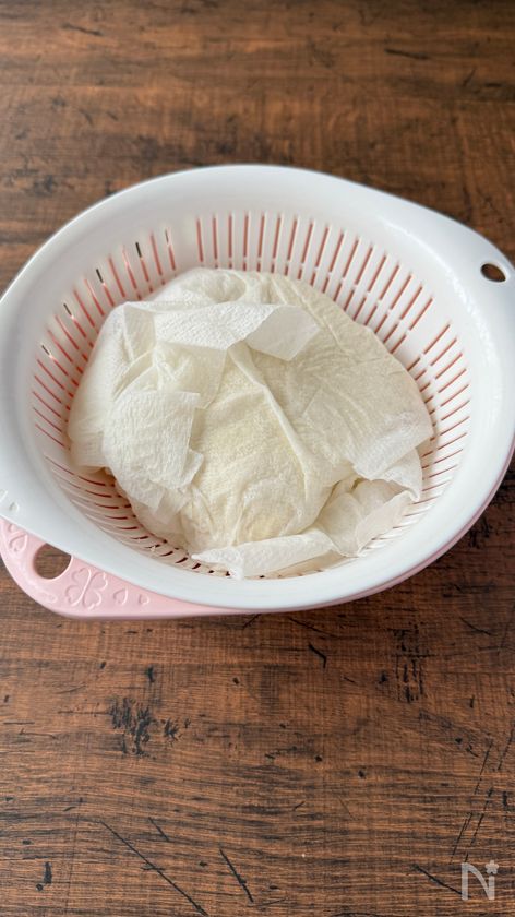 (下準備) 木綿豆腐はキッチンペーパーで二重に包みざるに置いて重しを乗せ一晩おき、水気を切る。