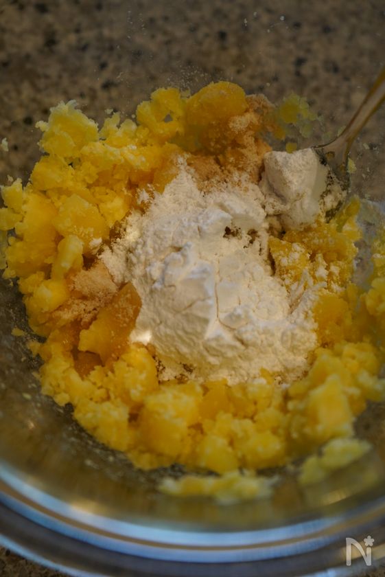 (1) 熱いうちにフォークでつぶし、こめの香(グルテンフリー)、牛乳、砂糖を加え、混ぜながらさらにつぶす。