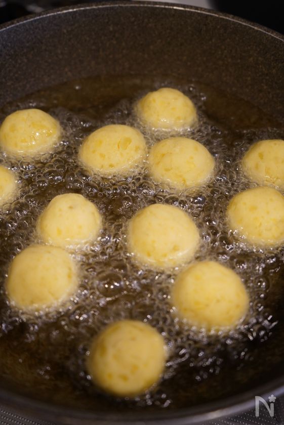 (3) フライパンにサラダ油を約4cm深さまで入れ、弱火~中火で加熱し、2を揚げる。油に入れて1分ほどは触らず、その後、転がしなら、全体が茶色く色づくまで揚げる。