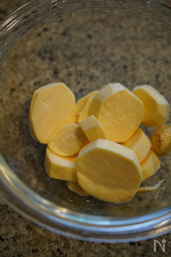 (下準備) さつまいもは皮をむき、1cm幅の輪切りにし、5分ほど水にさらす。水気を切り、耐熱容器に入れてふんわりとラップをかけて、電子レンジ(600W)で5分加熱する。