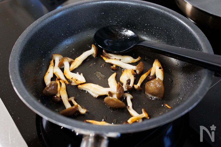 しめじはほぐし、ごま油を熱したフライパンでしんなりするまで炒める。