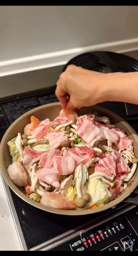 (2) フライパンに、白菜、にんじん、しめじを入れ、上に豚バラ肉を広げながらのせる。フライパンの端に冷凍エビをそのまま入れたら、酒を回し入れ蓋をして中火にかける。