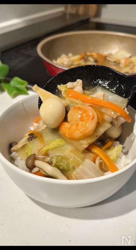 (5) とろみがつき、火が通ったら、器に盛った温かいごはんの上にのせる。