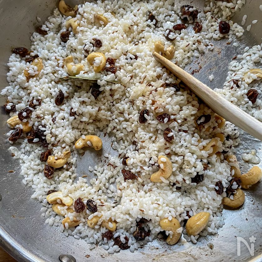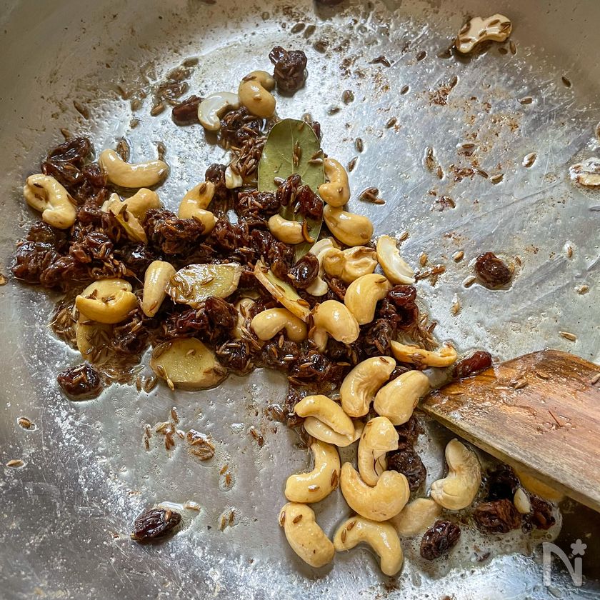 (4) 香りが立ったら、カシューナッツ、レーズンを加えてさらに炒める。