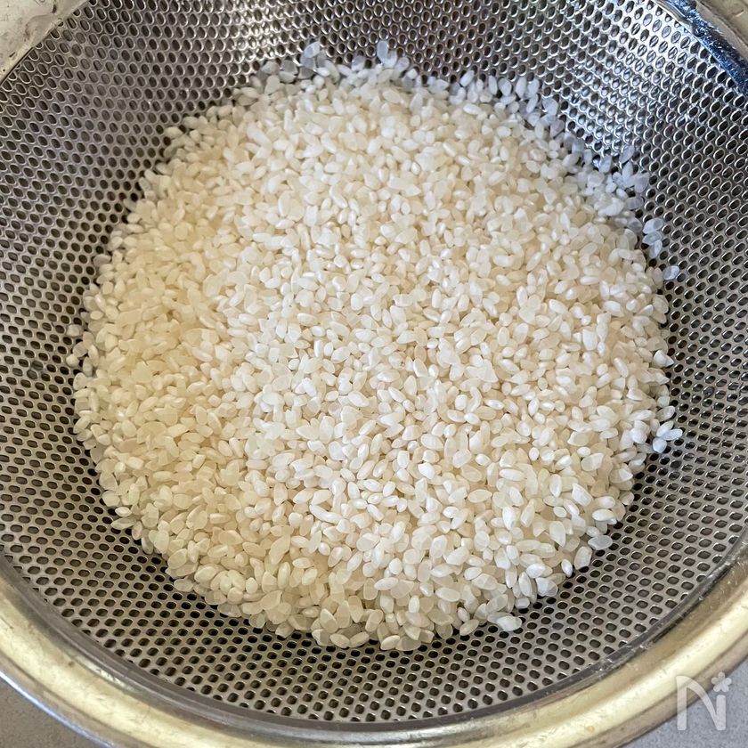(下準備) 米は洗ってザルにあげ、30分置く。