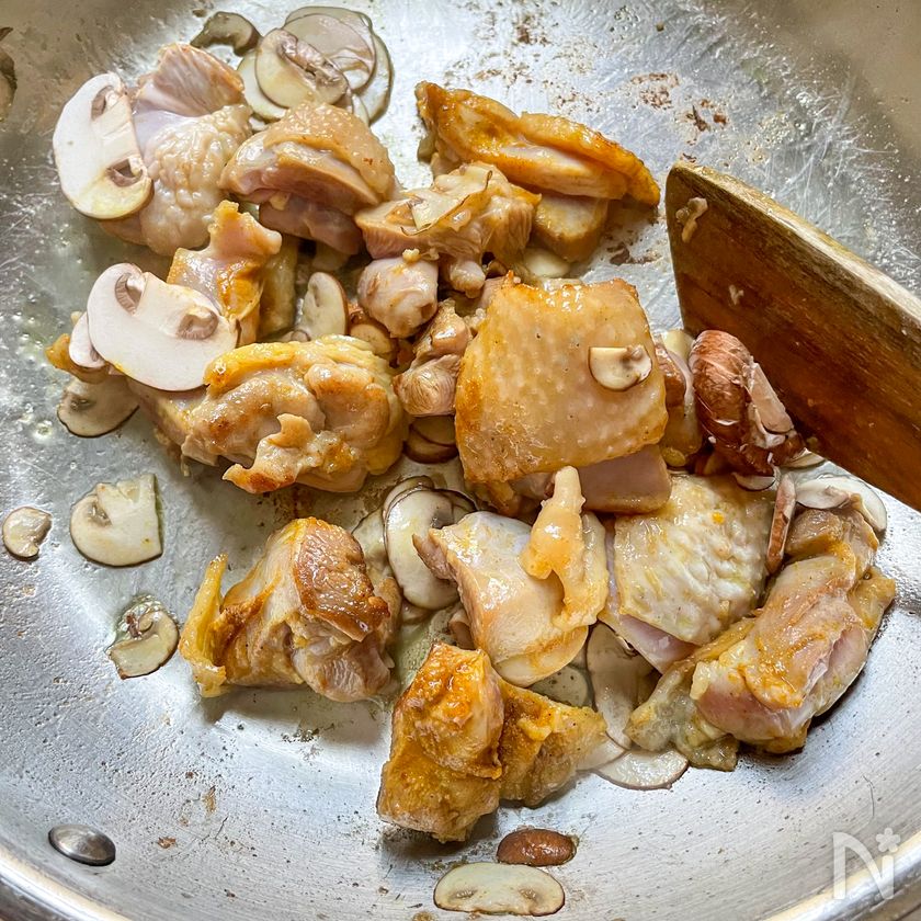 マッシュルームも加えてサッと炒め、いったん鍋から取り出す。