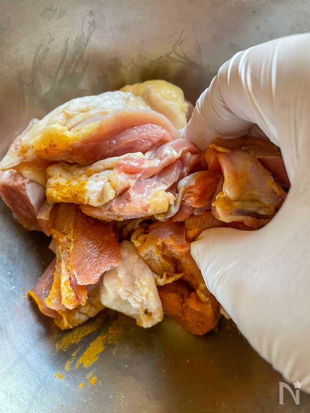 (1) 鶏もも肉は一口大に切り、【A】をもみこむ。