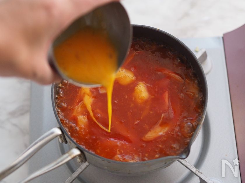 (4) 火力を中火にし、全体がふつふつとしたところに溶き卵を回し入れる。卵が固まったら火を止める。カニカマを加えてごま油をひと回しし、器に盛って好みで刻んだ青ねぎを散らす。