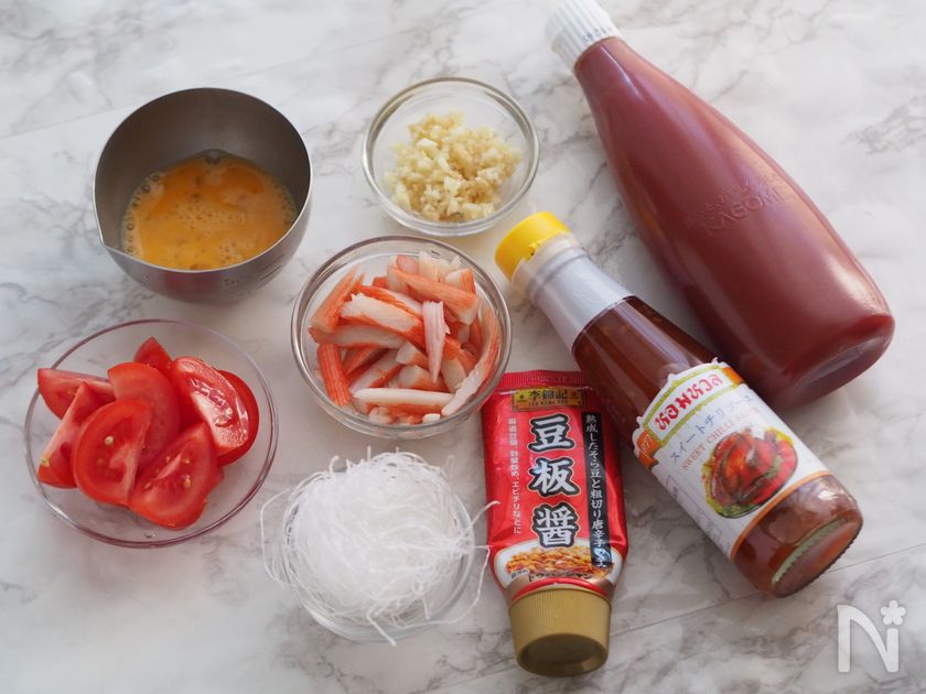 (下準備) ▶カニカマは5mm程度の斜め切りに、トマトはヘタを取り除いて8等分のくし形に切る。