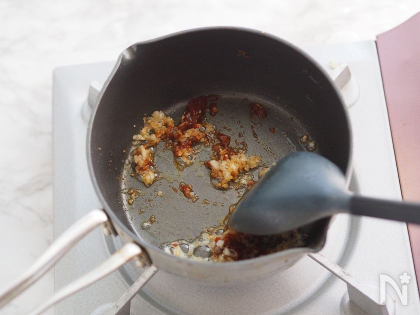 (1) 小鍋にごま油とにんにく、しょうがのみじん切りを入れて火にかけ、弱火で香りが出るまで炒める。