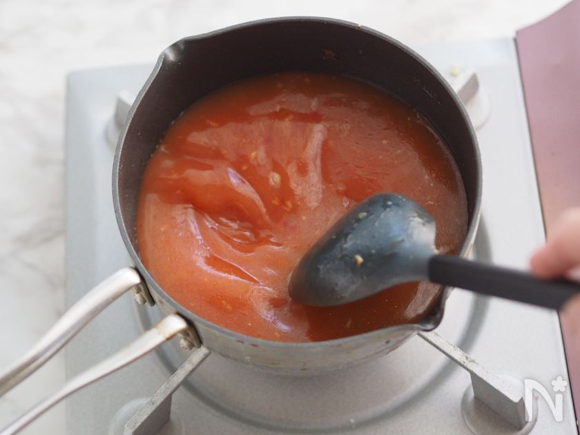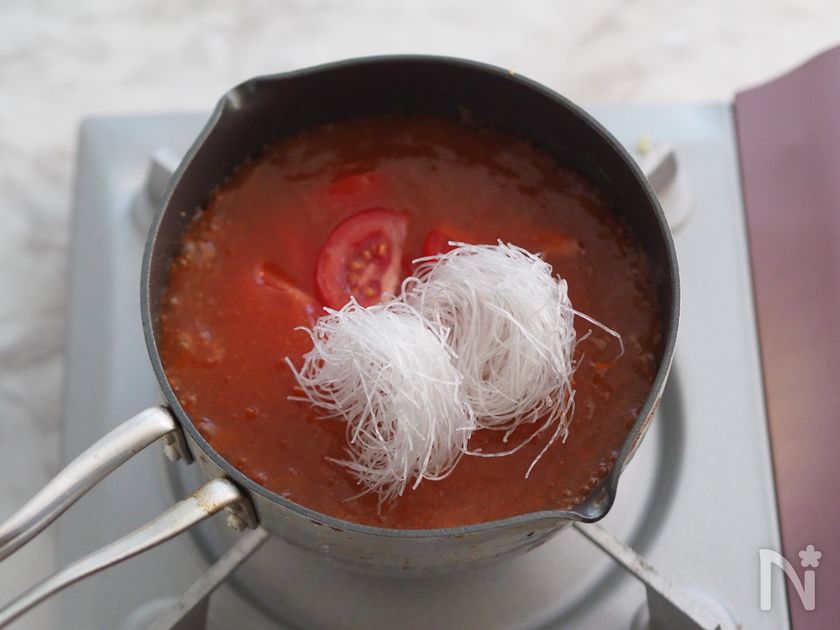 (3) トマトと春雨を加えて、春雨をほぐしながら弱火で1分ほど煮る。
