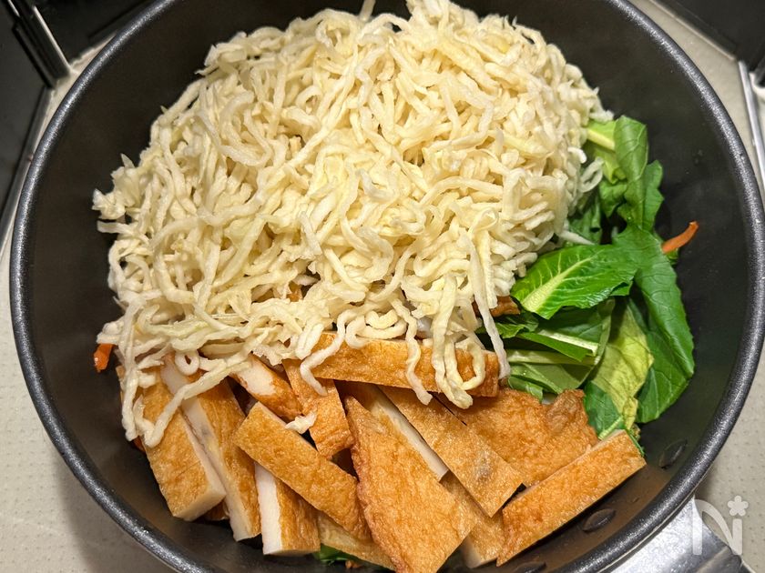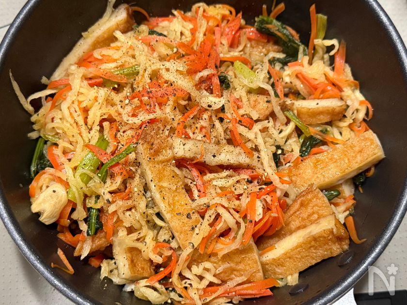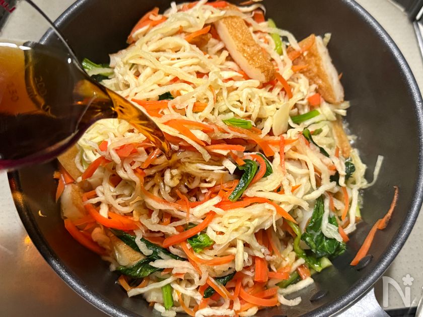 (2) にんじんが柔らかくなったら、湯切りした切り干し大根、小松菜の葉の部分、さつま揚げを加え軽く混ぜながら炒める。