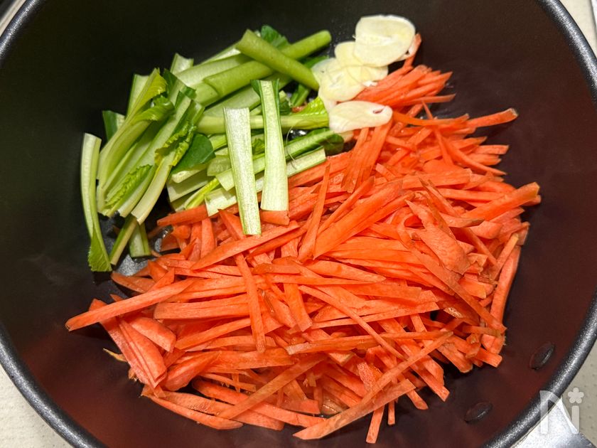 (1) 鍋にサラダ油を熱し、にんじん、小松菜の茎の部分、ニンニク(薄切り)をいれ炒める。