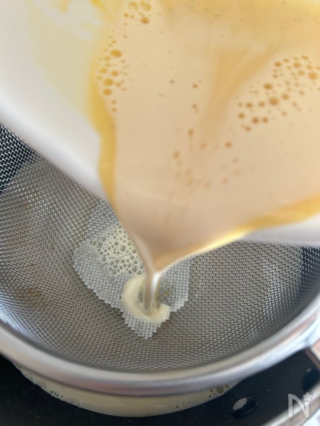 (4) 小鍋を洗い、水分を拭き取り、工程③をこしながら入れる。