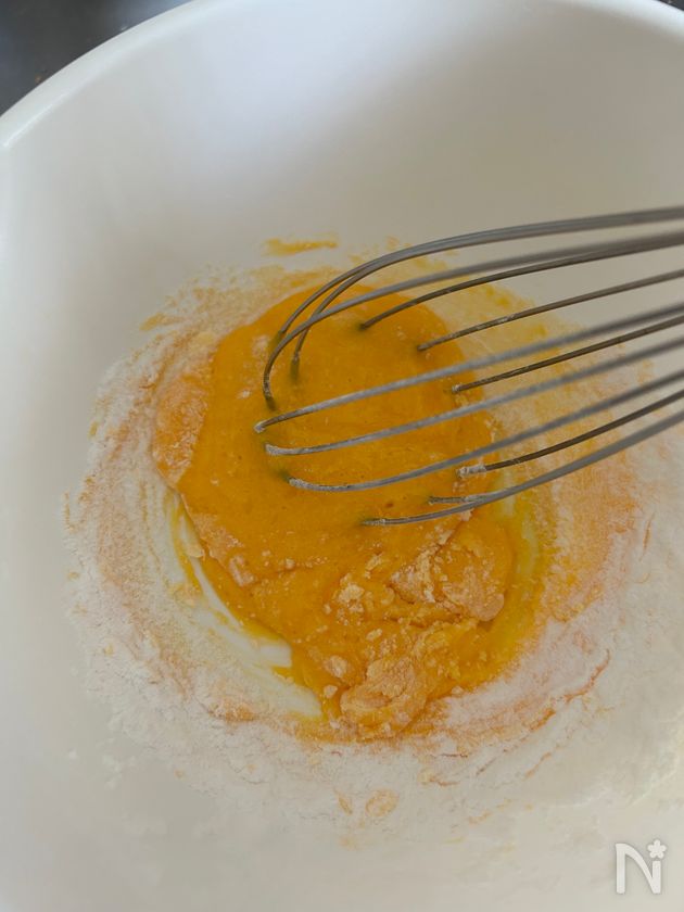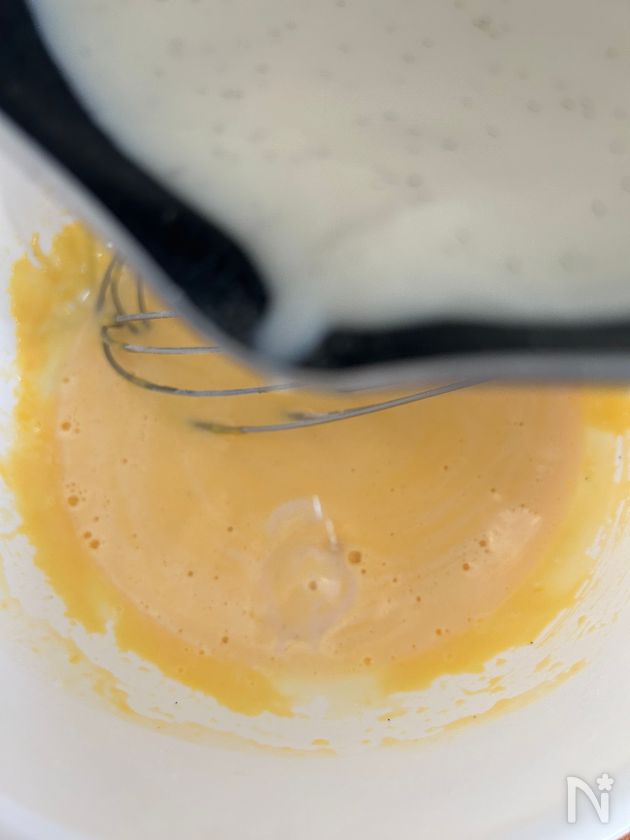(3) 工程①を少しずつボウルに加え、混ぜ合わせる。