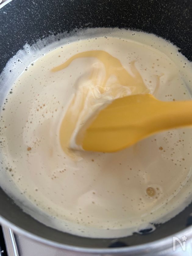 (5) 中火〜弱火の間で温め、ゴムベラまたは木ベラで手を止めないように常にかき混ぜる。