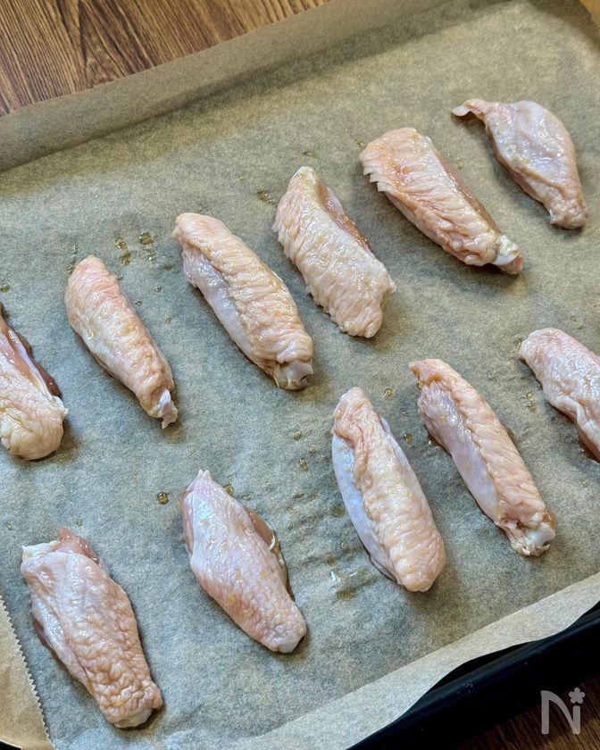 (2) 天板にオーブンシートを敷き、手羽中を重ならないように並べる。200℃に予熱したオーブンで15分焼く。焼き色を見て、足りない場合はさらに2〜3分焼く。