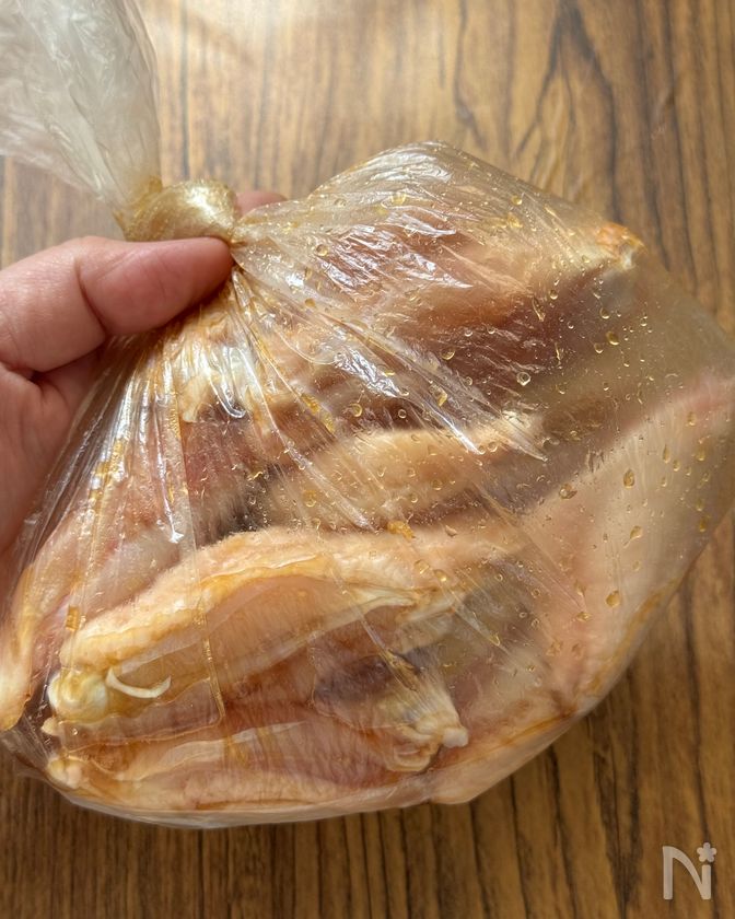 (1) 鶏手羽中は水気をキッチンペーパーでふき取る。ポリ袋またはボウルに入れて【A】を加え、よくもみ込む。20分ほどおいて味をなじませる。