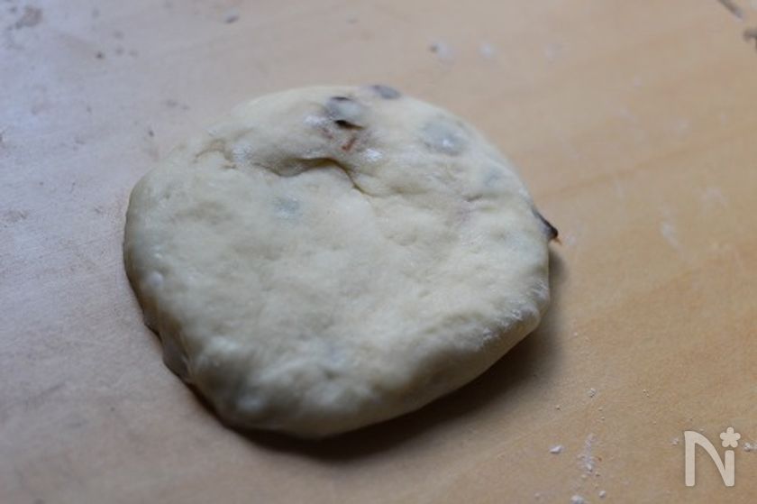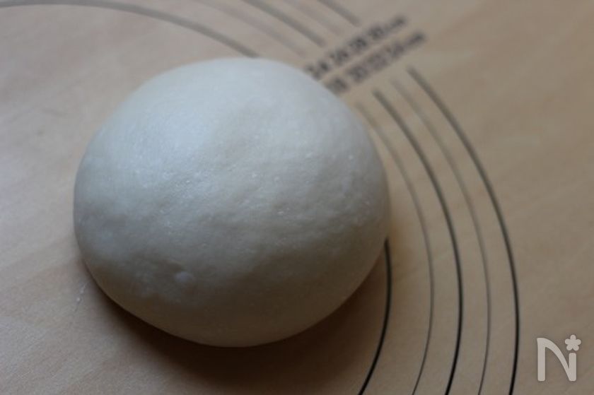 (3) 表面がなめらかになるまで捏ね、生地を軽くまるめ、平にする。