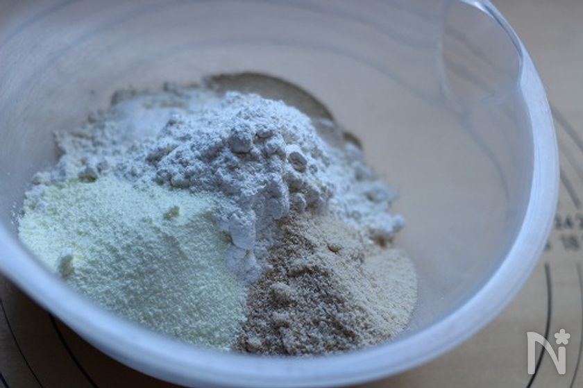 (1) 【A】の材料をよく混ぜ、牛乳を入れ捏ねる。粉気が無くなったら台の上に出し更に捏ねる。