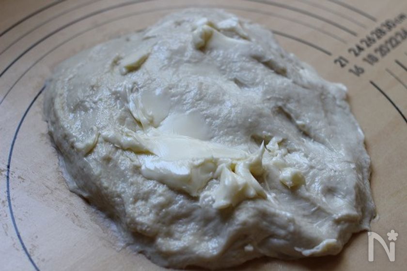 (2) 生地が繋がったら室温に戻した無塩バターを入れ、更に捏ねる。