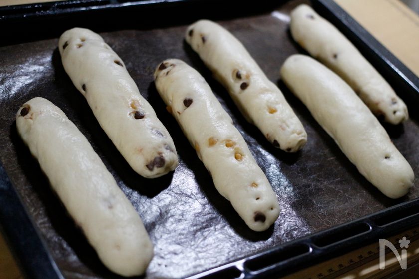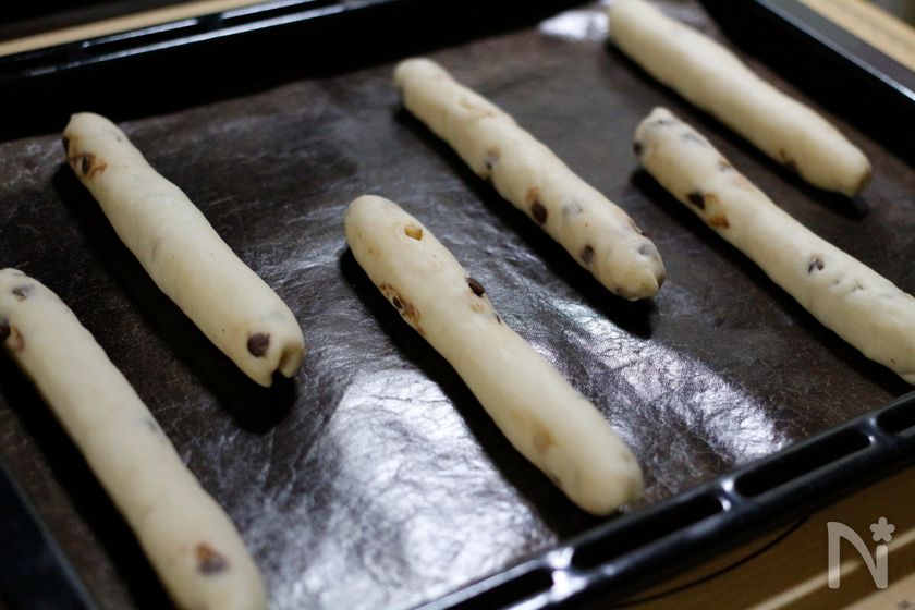 (12) 18㎝前後に伸ばし、クッキングペーパーまたはオーブンシートを敷いた天板に並べる。