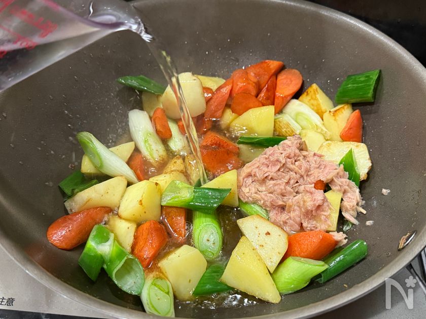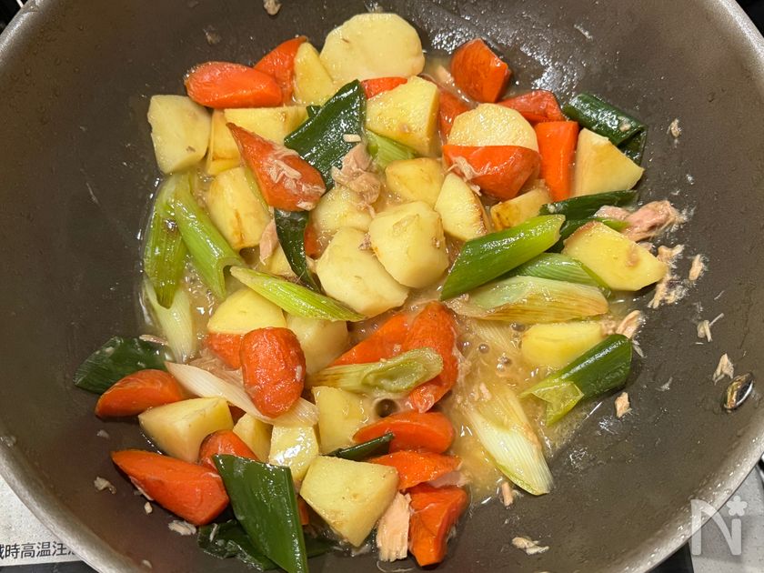 (4) ツナ缶(汁気含む)、【A】を加え煮詰める。