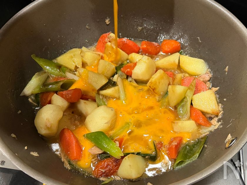 (6) 溶いた卵を回し入れ、ふたをする。