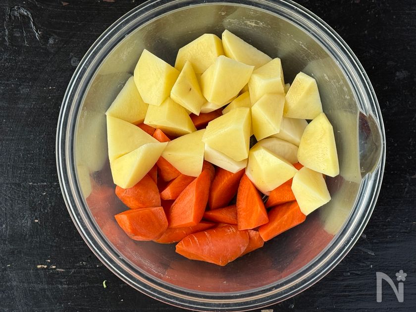 じゃがいもとにんじんは予め加熱しておくと時短になります。
