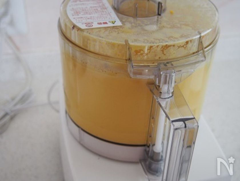 (2) 1と【A】を全てミキサーかフードプロセッサーに入れて、なめらかになるまで攪拌する