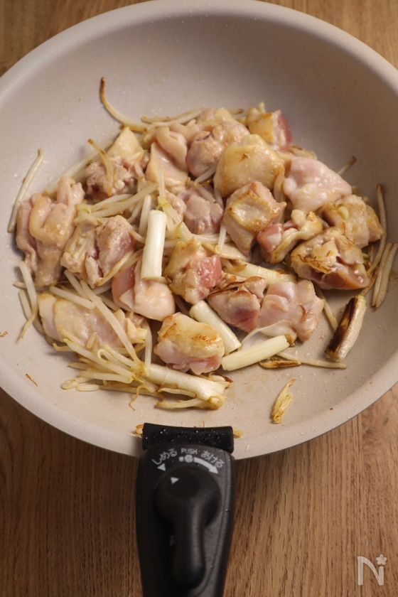 (2) 一口大に切った鶏モモ肉を加え、色が変わるまで炒める。
