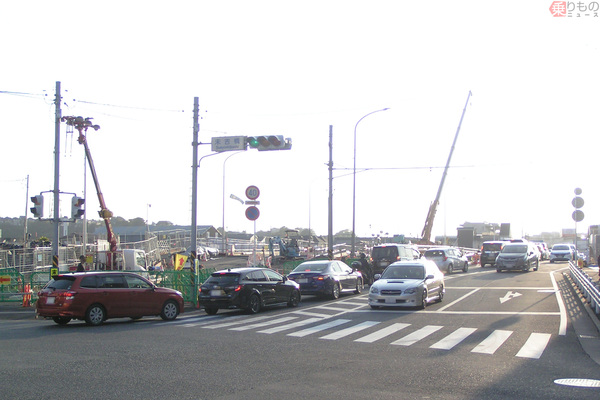 末吉橋は1950(昭和25)年から1964(昭和39)年にかけて竣工。橋上が交通量の多い2つの県道の重複区間であるものの幅が狭く、橋の両詰にある交差点付近では慢性的な渋滞が発生しています。