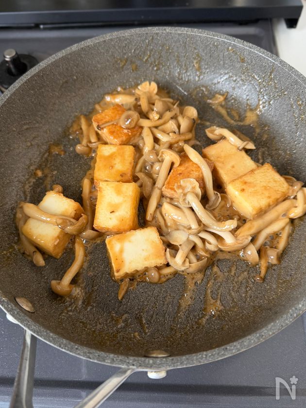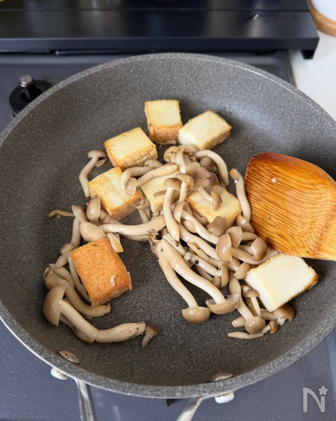 (2) フライパンにごま油をひき中火で熱し、厚揚げ、しめじを入れて2分ほど炒める。