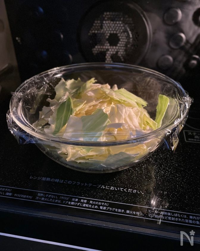 (1) キャベツは食べやすい大きさにちぎる。ふんわりとラップをかけて600wのレンジで5分加熱する。