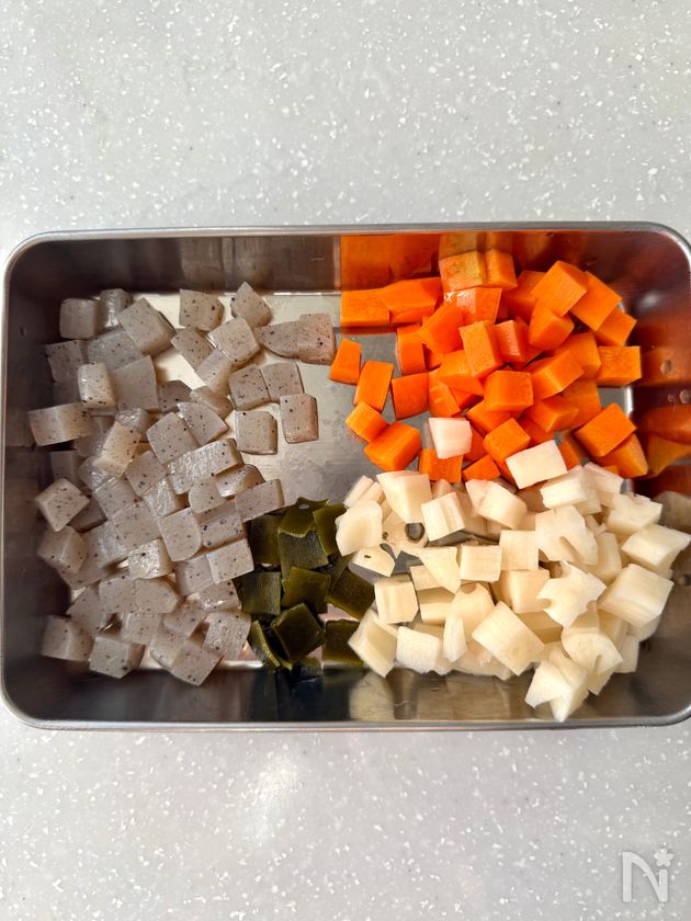 (1) 昆布(5×5cm)は1cm四方、こんにゃく、れんこん、にんじんは1cm角に切り、こんにゃくは沸騰した湯で茹でる。