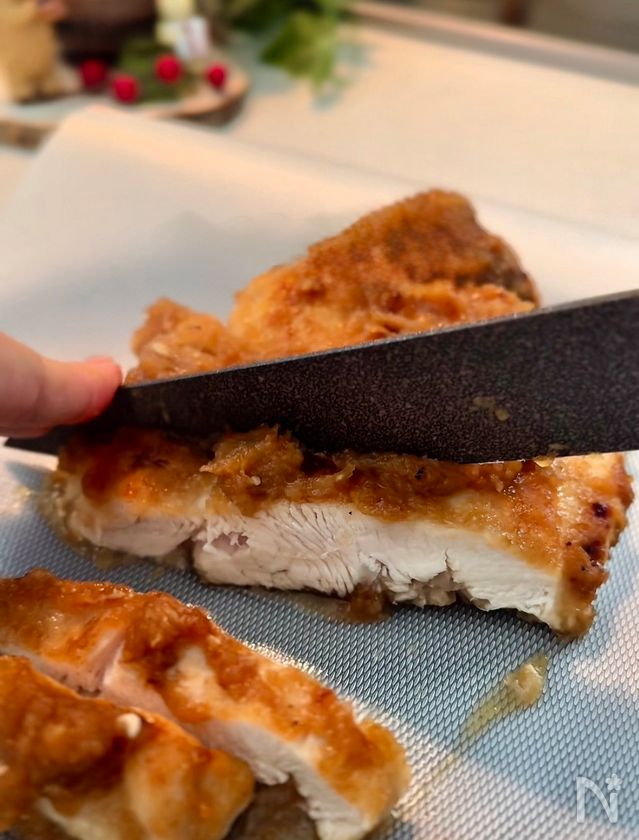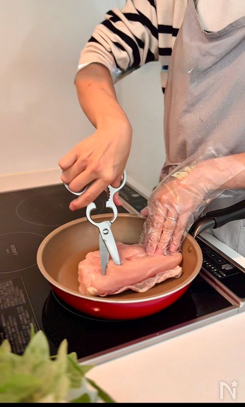 (1) 鶏胸肉は、厚いところを包丁やキッチンバサミで開いて厚さを均等にする。フォークで満遍なく刺しておく。