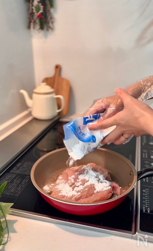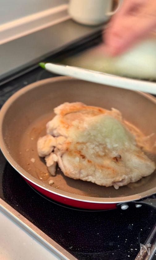 (2) ①の両面に塩コショウ、片栗粉をまぶす。中火に熱したフライパンに油をひき、焼いていく。