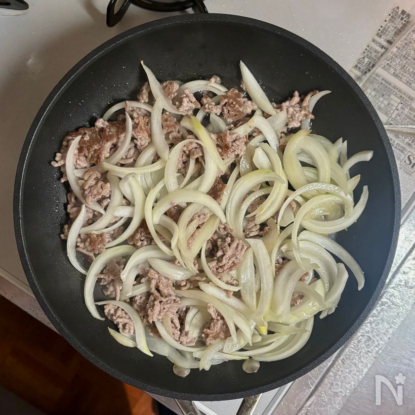 玉ねぎを加え、ひき肉をほぐしながら1分ほど炒める。