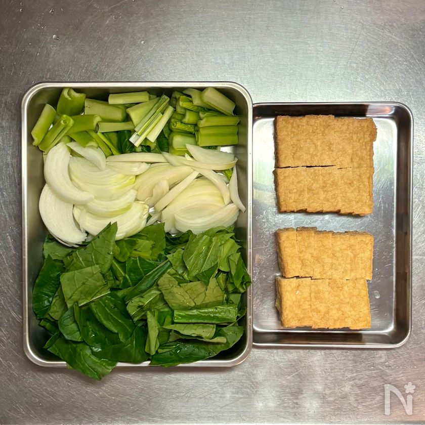 厚揚げはペーパータオルで油を拭き、縦半分に切ってから横1cm幅に切る。