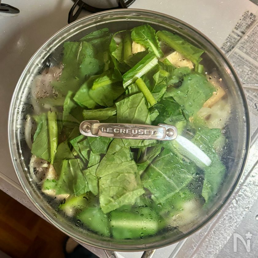 小松菜の葉を加え、再びふたをして1分ほど煮る。