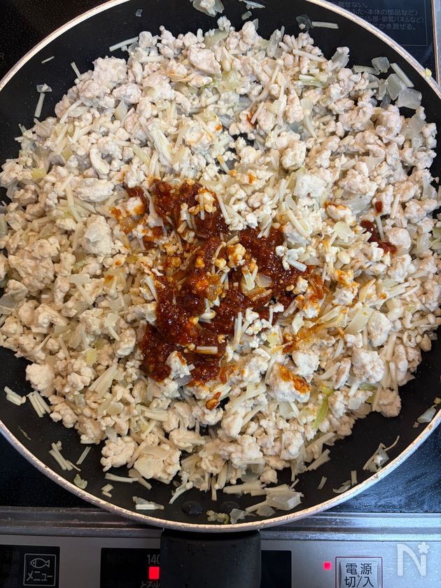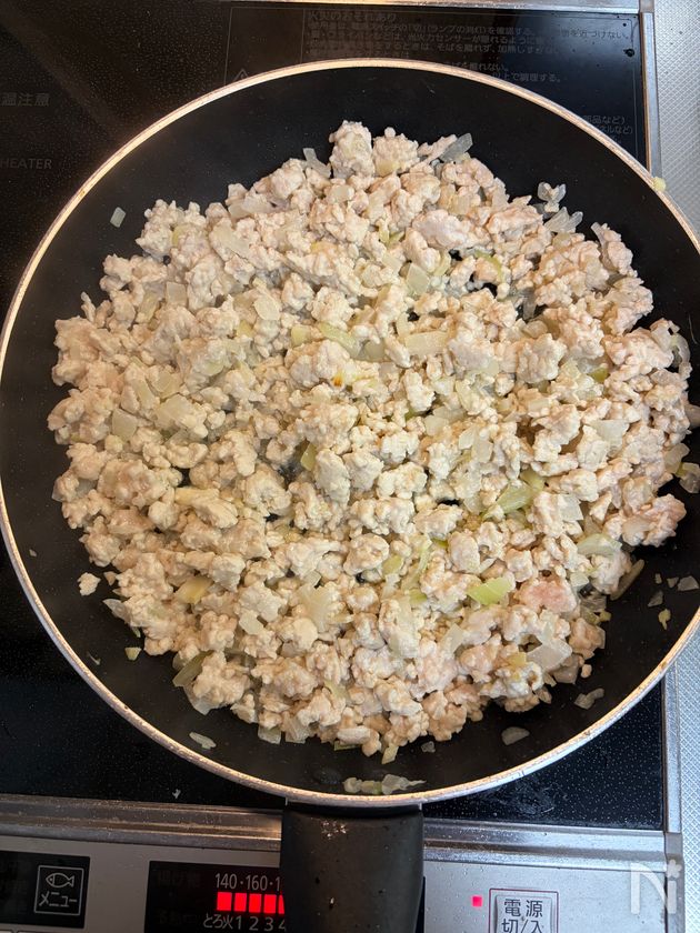 (1) フライパンにごま油を熱し、生姜と玉ねぎを炒める。香りが立ったら鶏ひき肉を加え、塩・こしょうをふってしっかり炒める。