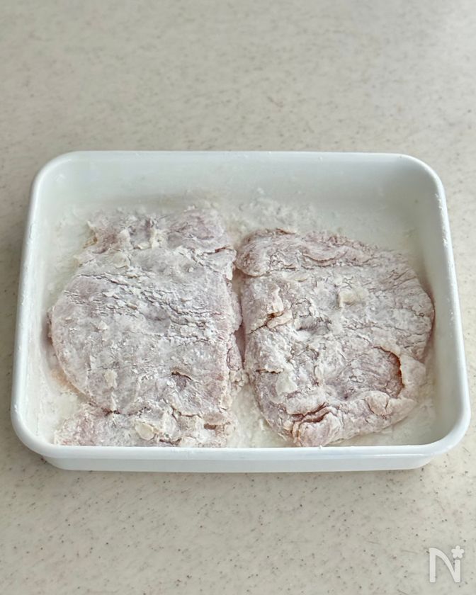 (3) 薄力粉を薄くまぶし、さらに片栗粉をしっかりとつける。