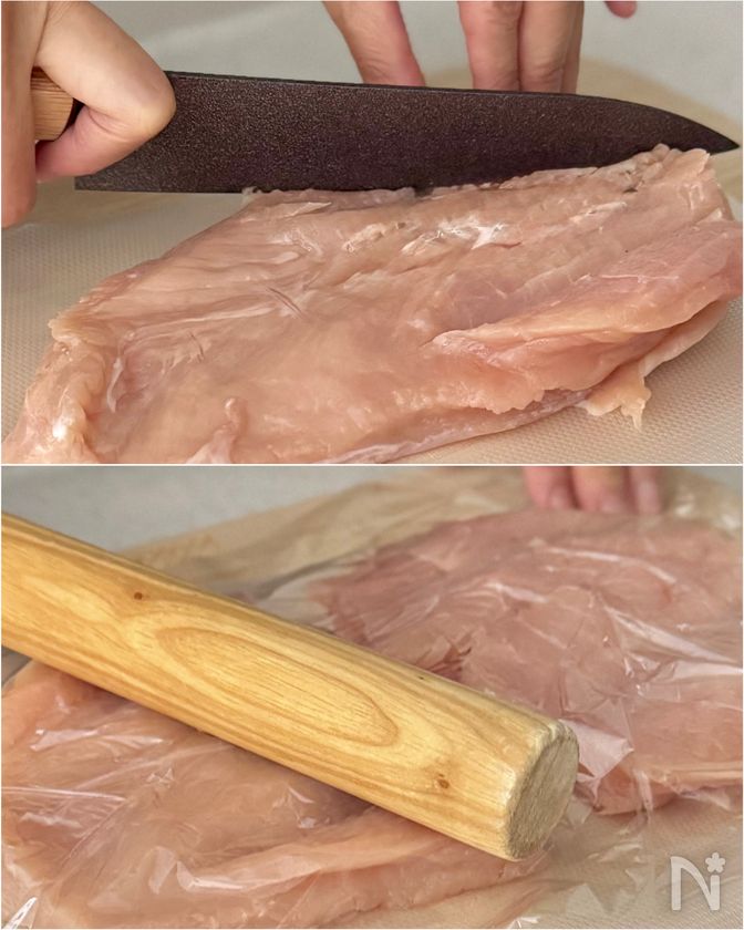 (1) 鶏むね肉は厚みのある部分は観音開きにし、厚みを均一にする。2等分に切り分け、ラップをかけた上から麺棒などで叩く。