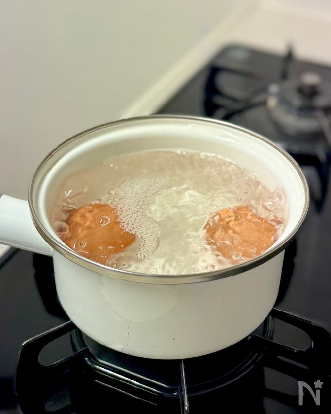(下準備) 卵をゆでておく。今回は冷蔵庫から出したすぐの卵を、沸騰したお湯に入れて9分茹でて、冷水に取りました。