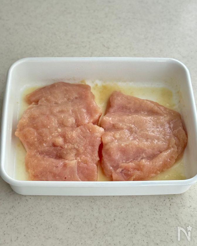 (2) 開いた鶏むね肉はバットなどに入れて【A】を揉み込む。30分〜1時間おく。