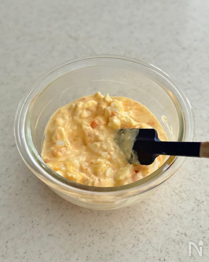 (5) ゆで卵をつぶして【B】を混ぜ合わせ、タルタルソースを作る。
