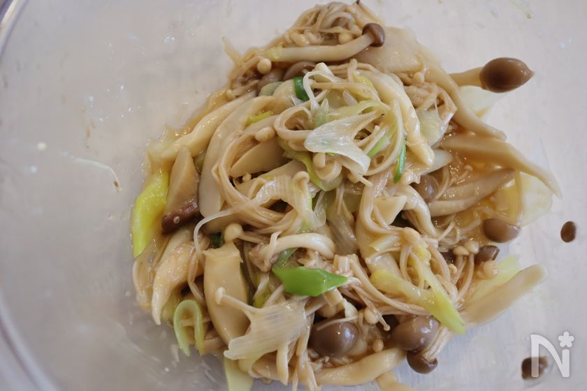 (1) キノコ(しめじ、エリンギ、えのきなど)、白ネギを耐熱ボールに入れふんわりとラップをして電子レンジ600wで5分加熱する。